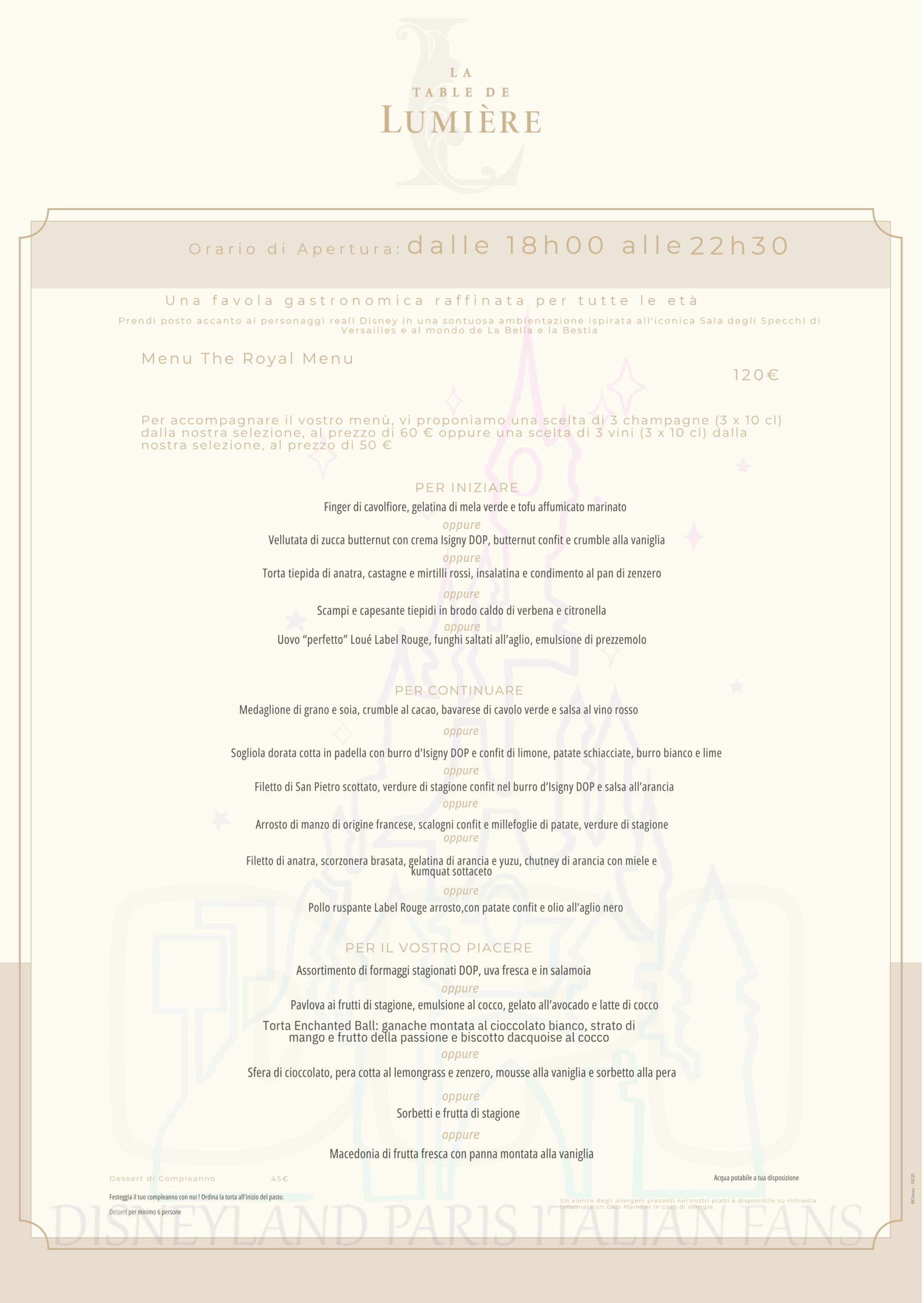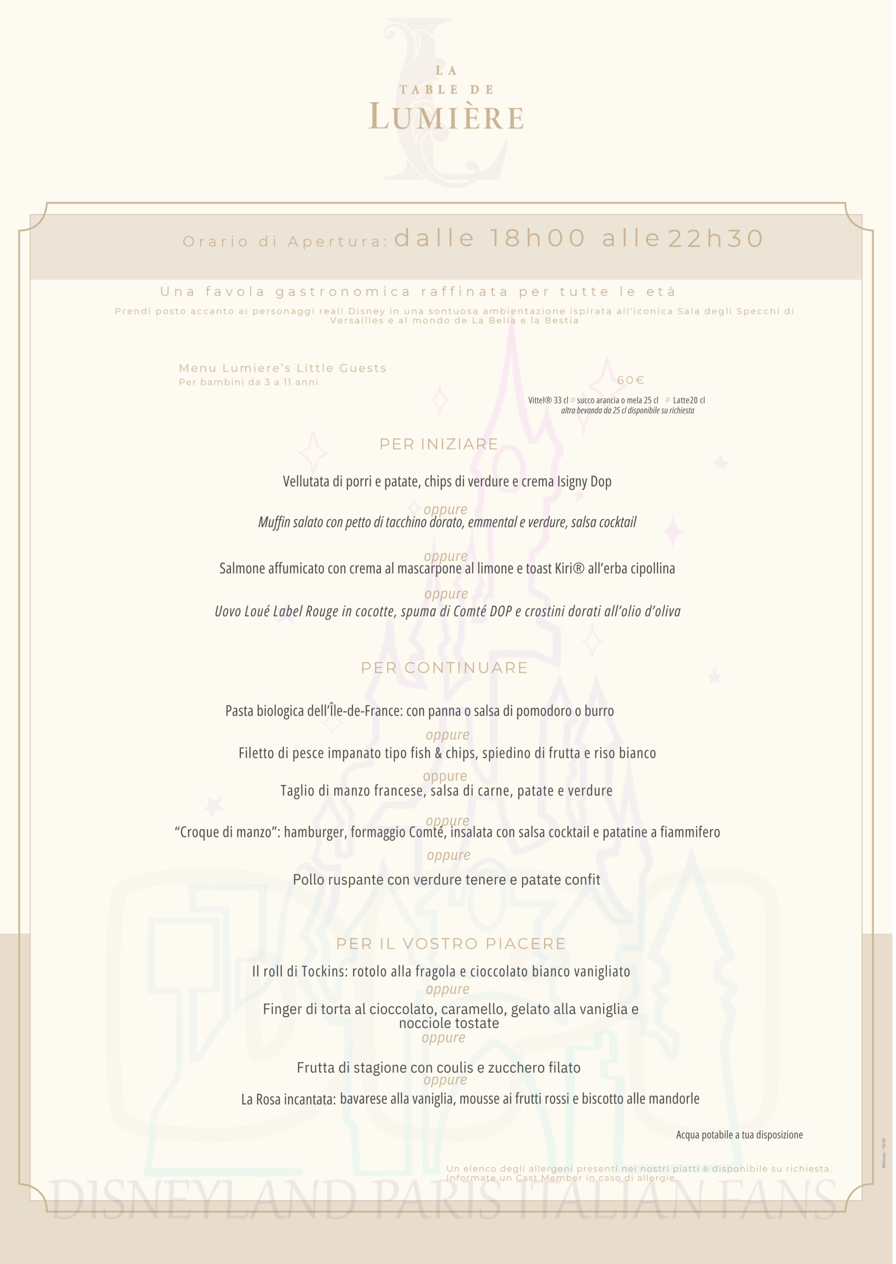 Qui trovate il sontuoso menu. Lo chef propone un menu “Scoperta” a €140 e un menu “Degustazione” a €200. Il prezzo del menu bambini è invece di €70. È possibile prenotare solo per la cena, dal mercoledì alla domenica dalle 18.30 alle 21.30. La cena non è inclusa in nessuna delle Formule per i Pasti, tuttavia è possibile utilizzare i coupon per i pasti per il loro valore nominale per coprire parte del conto.