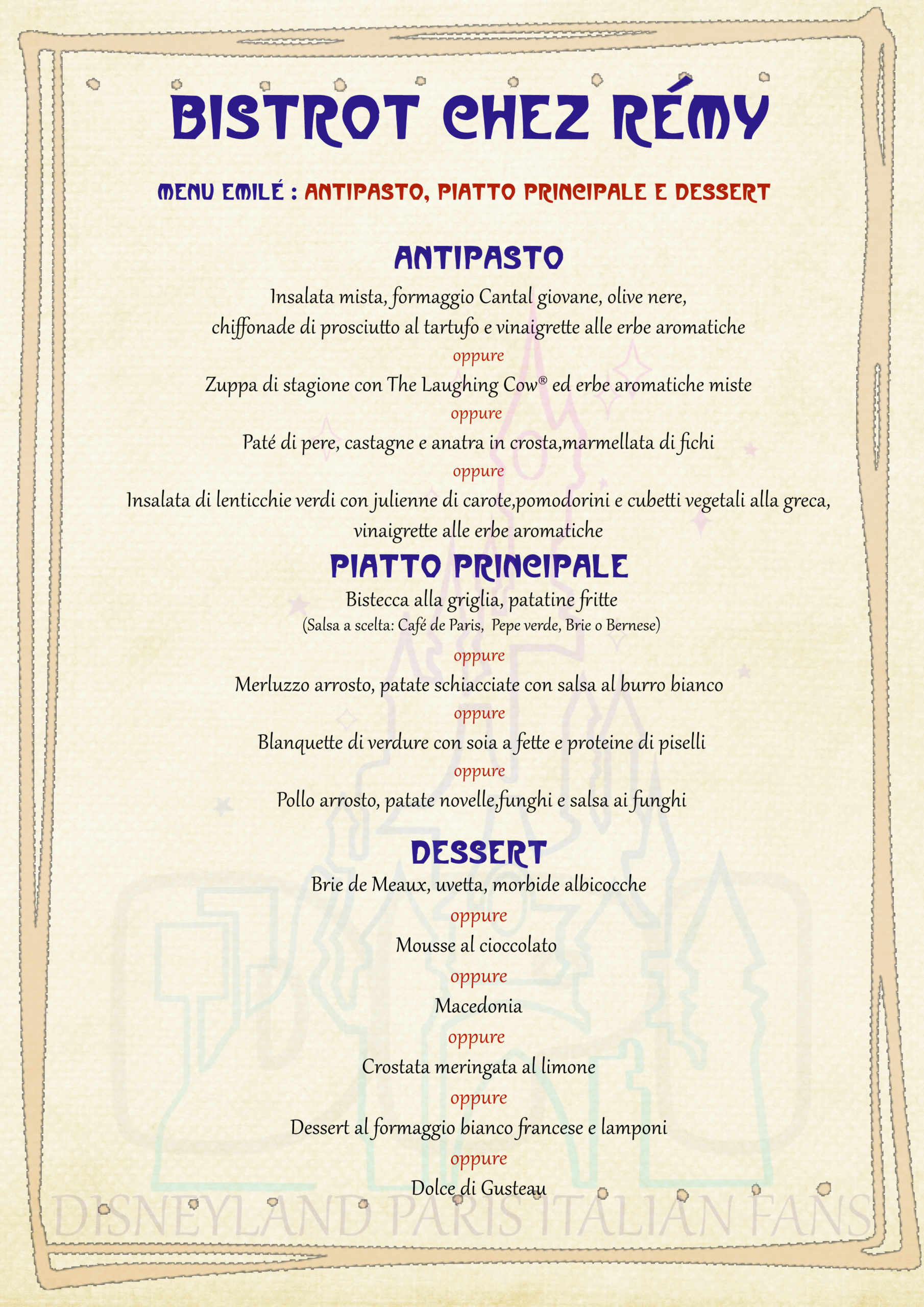Il ristorante del topino Rémy! Si trova ai Walt Disney Studios, ed entrando qui verrete rimpiccioliti alle dimensioni di un topolino ! Non ci credete ? Guardate l’arredamento! Il vostro tavolo e’ un piatto e la sedia un tappo di bottiglia. Entrate, ordinate dal nostro menu in italiano e Rémy cucinerà per voi la sua famosa ratatouille